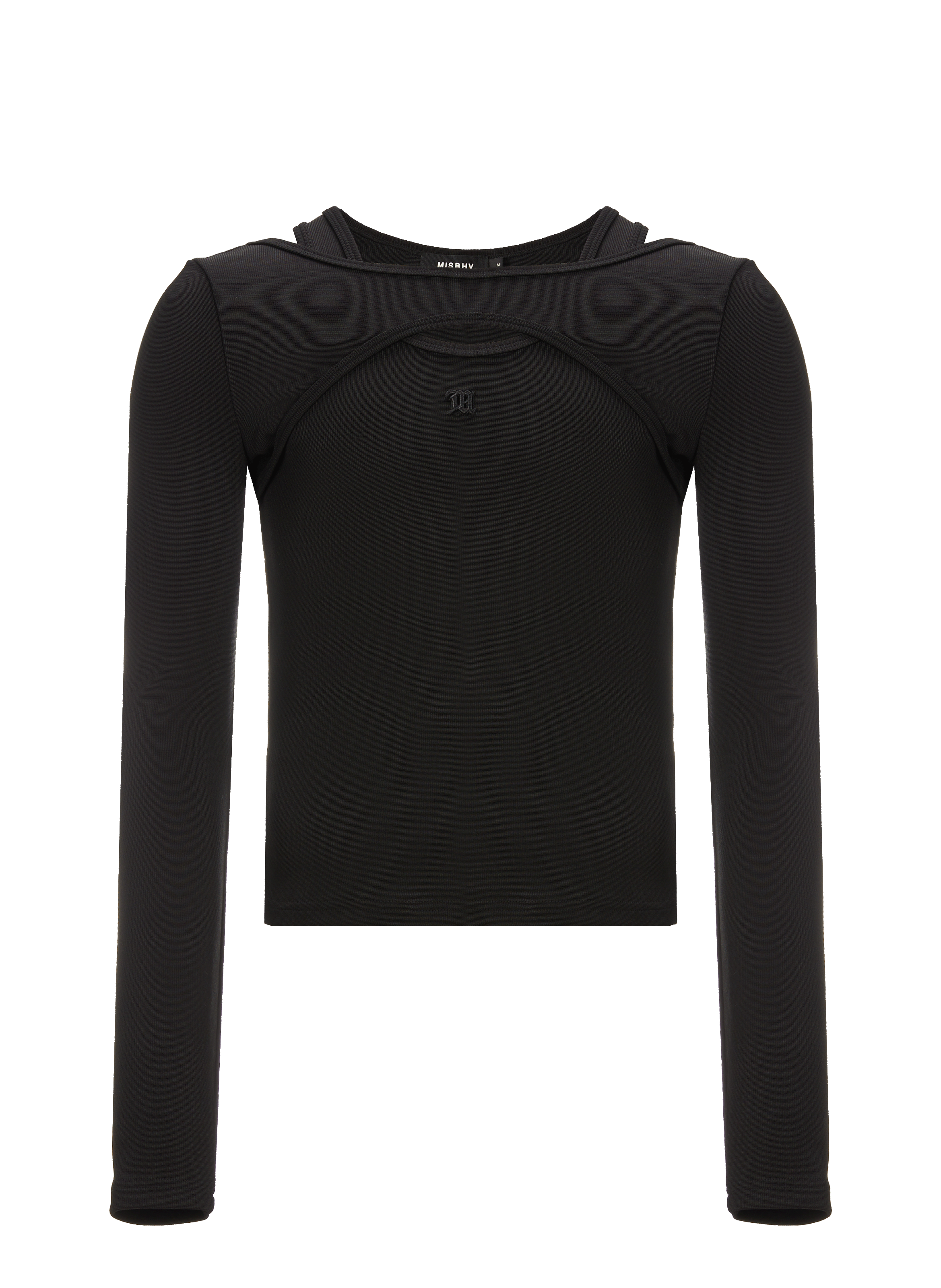 From the Fall-Winter 2023/2024 collection by MISBHV, this black straight top with long sleeves features a round neckline, a cutout at the chest, and an embroidered logo on the front. Subtly graphic.