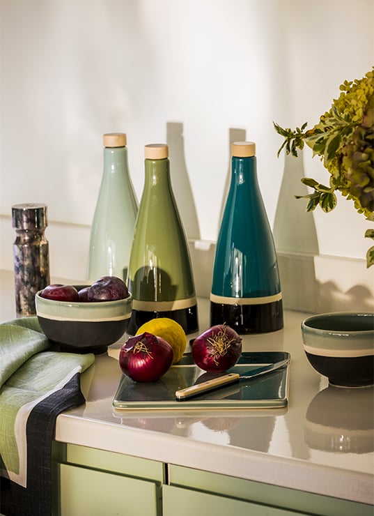 En touches plus discrètes, à travers un canapé, un tapis ou des céramiques, il apporte de la profondeur sans dominer. Associé au bois clair, au lin, au métal patiné ou à des tons sable, il révèle toute sa sophistication.