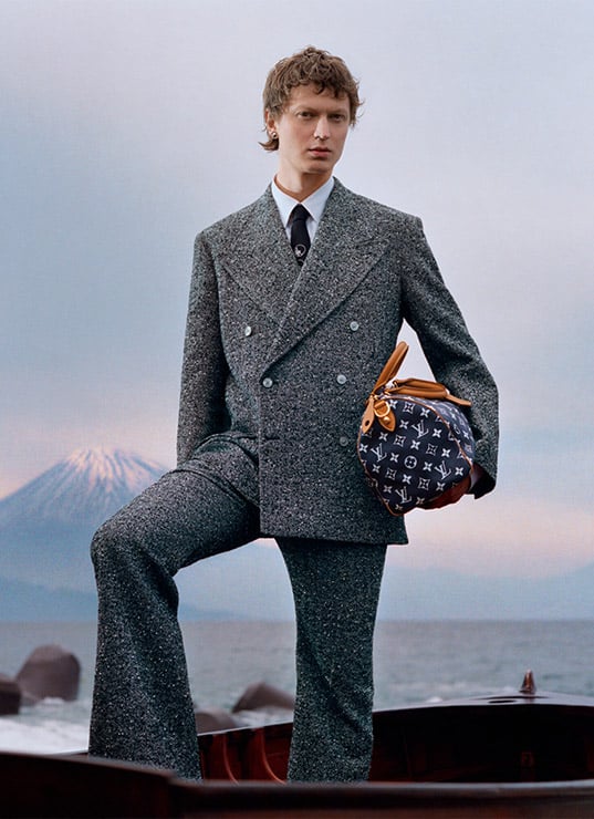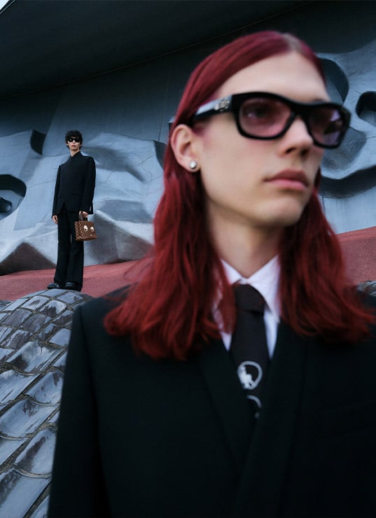 Les costumes structurés à épaule marquée, sublimés par des broderies fines et des jeux de texture, réinterprètent le tailoring traditionnel avec une allure décontractée. Les bottes à bout carré, les sacs Keepall revisités en cuir Monogram embossé et les lunettes aux lignes futuristes complètent ce vestiaire, affirmant l’alliance entre artisanat d’exception et modernité audacieuse.