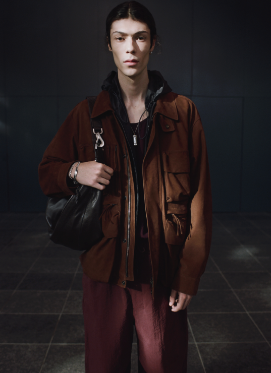 Le 2e look mise sur une subtilité androgyne grâce à des matières techniques qui mettent en dialogue des coupes légères et structurées.