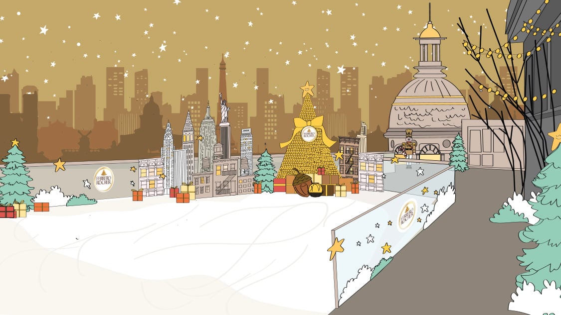 Comme dans un film de Noël, le Printemps et FERRERO ROCHER® vous invitent à vivre une expérience magique sur la terrasse du 7ème Ciel, transformée pour l’occasion en une patinoire féérique. En glissant sur la glace, on se croirait à Manhattan, mais avec vue directe sur la tour Eiffel. Entre gratte-ciel stylisés, balustrades chics et une pyramide dorée XXL, le décor joue les passerelles entre Paris et New York.