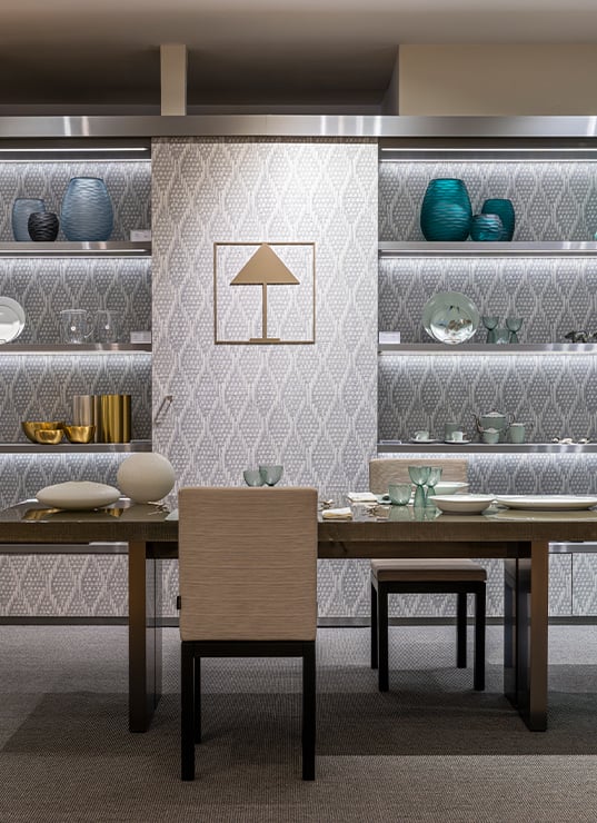Si le mobilier en pose les bases, ce sont les accessoires et l’art de la table qui en révèlent toute la subtilité. Vaisselle aux lignes épurées, verres délicats, plateaux laqués et objets décoratifs composent un univers où chaque détail compte, apportant une touche de raffinement au quotidien.