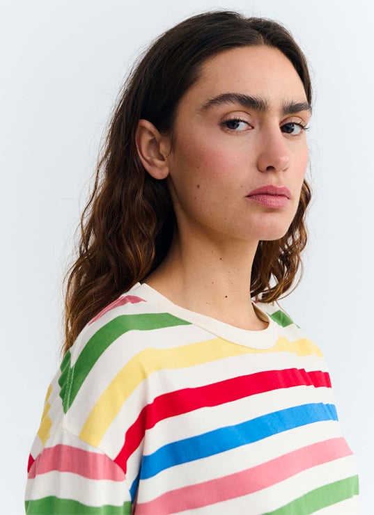 Couleurs franches, imprimés arty, silhouettes décontractées : Thinking MU cultive une esthétique joyeuse, libre, presque instinctive. Mais derrière cette allure easy se cache une exigence forte — matières biologiques ou recyclées, transparence des processus, respect des savoir-faire. Chaque pièce raconte une histoire, pensée de la fibre au produit fini.