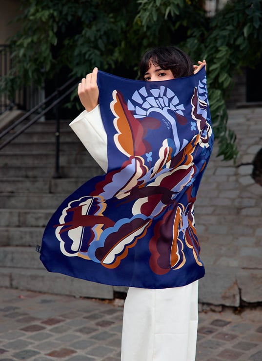 Carrés, foulards et accessoires en soie se parent de motifs poétiques et de couleurs vibrantes, inspirés par la nature et la lumière. Chaque création raconte une histoire : un ballet de renards, un jardin impressionniste, une flânerie sous les figuiers… Pensée pour accompagner les femmes avec élégance et légèreté.