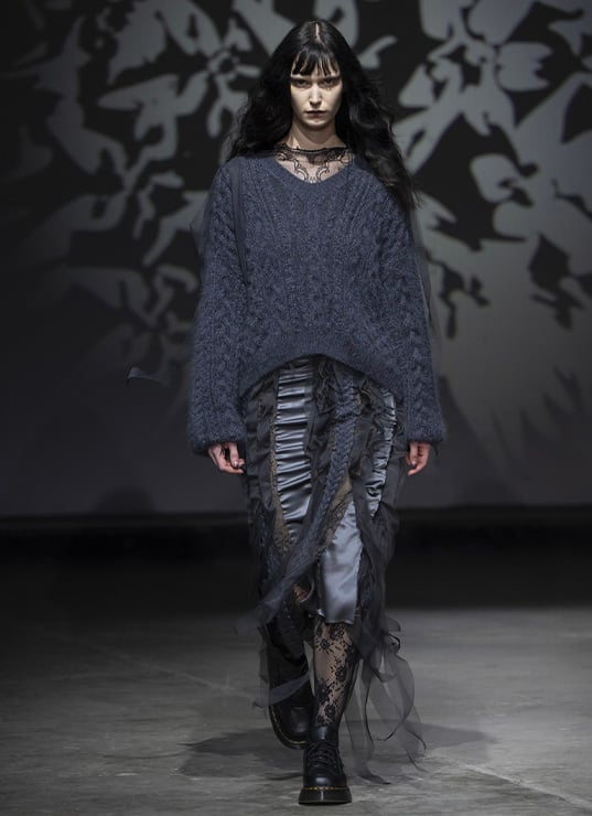 Ses silhouettes mêlent mailles torsadées, fleurs crochetées et tissus vaporeux, dans un équilibre subtil entre structure et fragilité. Les tons brumeux s’animent d’un rouge intense, hommage à la floraison symbolique de la plante.