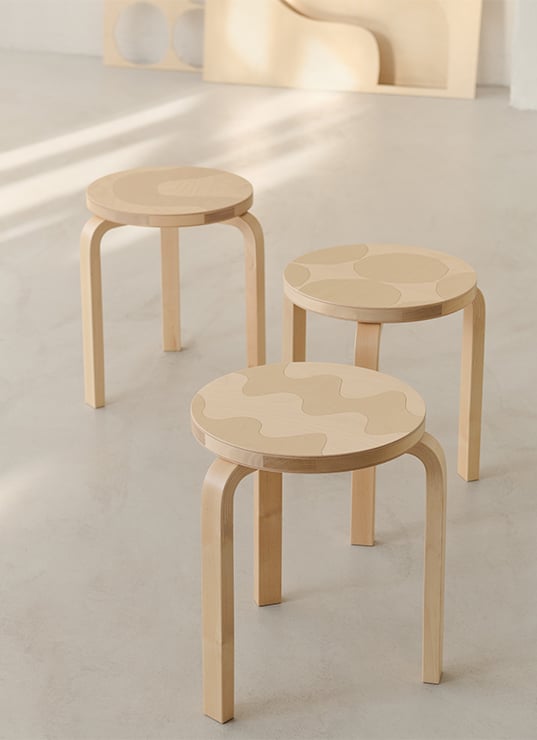 La rencontre entre Artek x Marimekko célèbre tout ce que le design finlandais a de plus beau : la simplicité élégante des meubles d’Artek et l’énergie des imprimés colorés de Marimekko. Ensemble, ils réinventent des pièces iconiques comme le tabouret Stool 60, le banc 153B ou la table 90D, habillés de motifs joyeux en marqueterie comme Kivet ou Lokki.