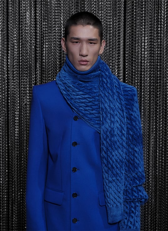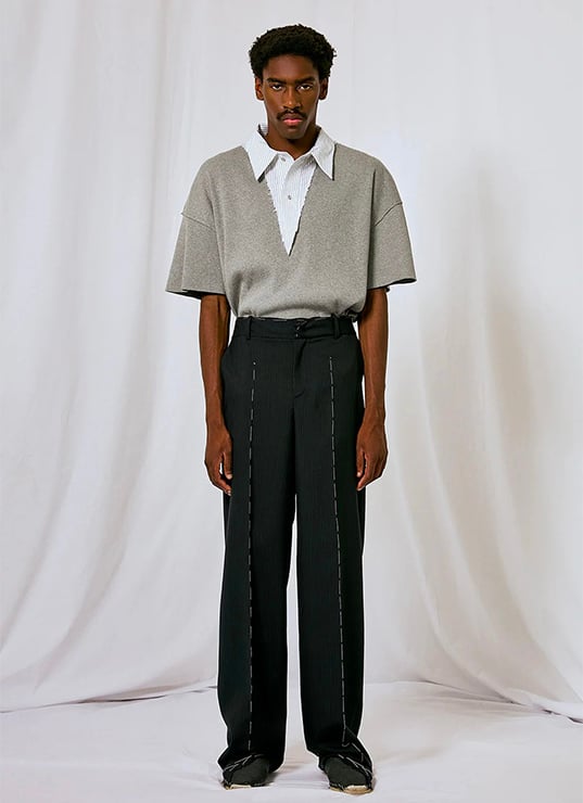 Ses coutures apparentes — sa signature — ne cachent rien. Elles révèlent le processus, transforment la technique en élément graphique et redéfinissent le costume, entre sophistication assumée et radicalité maîtrisée.