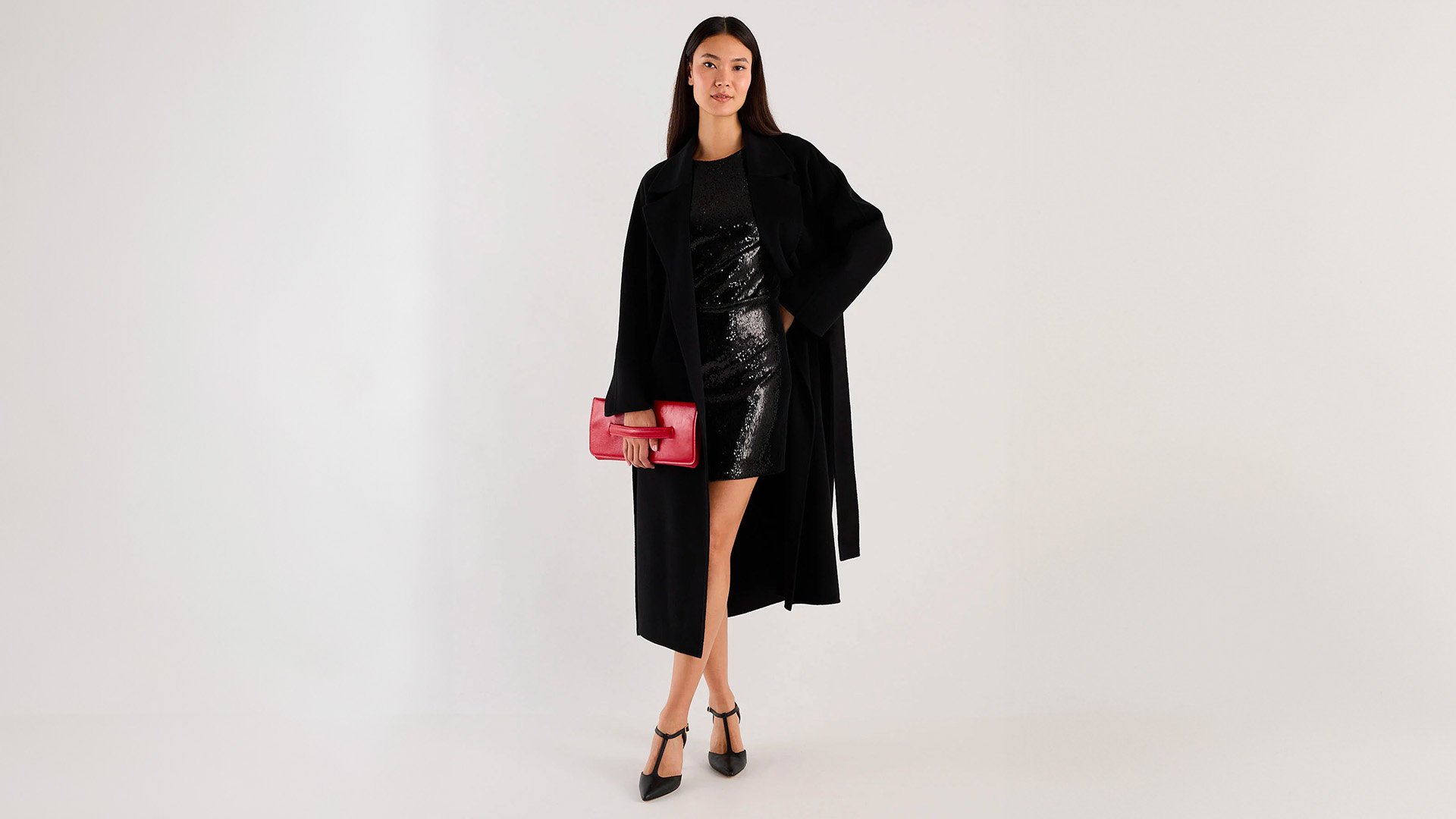 Portée avec un manteau long en laine et des bottes hautes, elle crée un contraste sophistiqué entre brillance et textures hivernales.