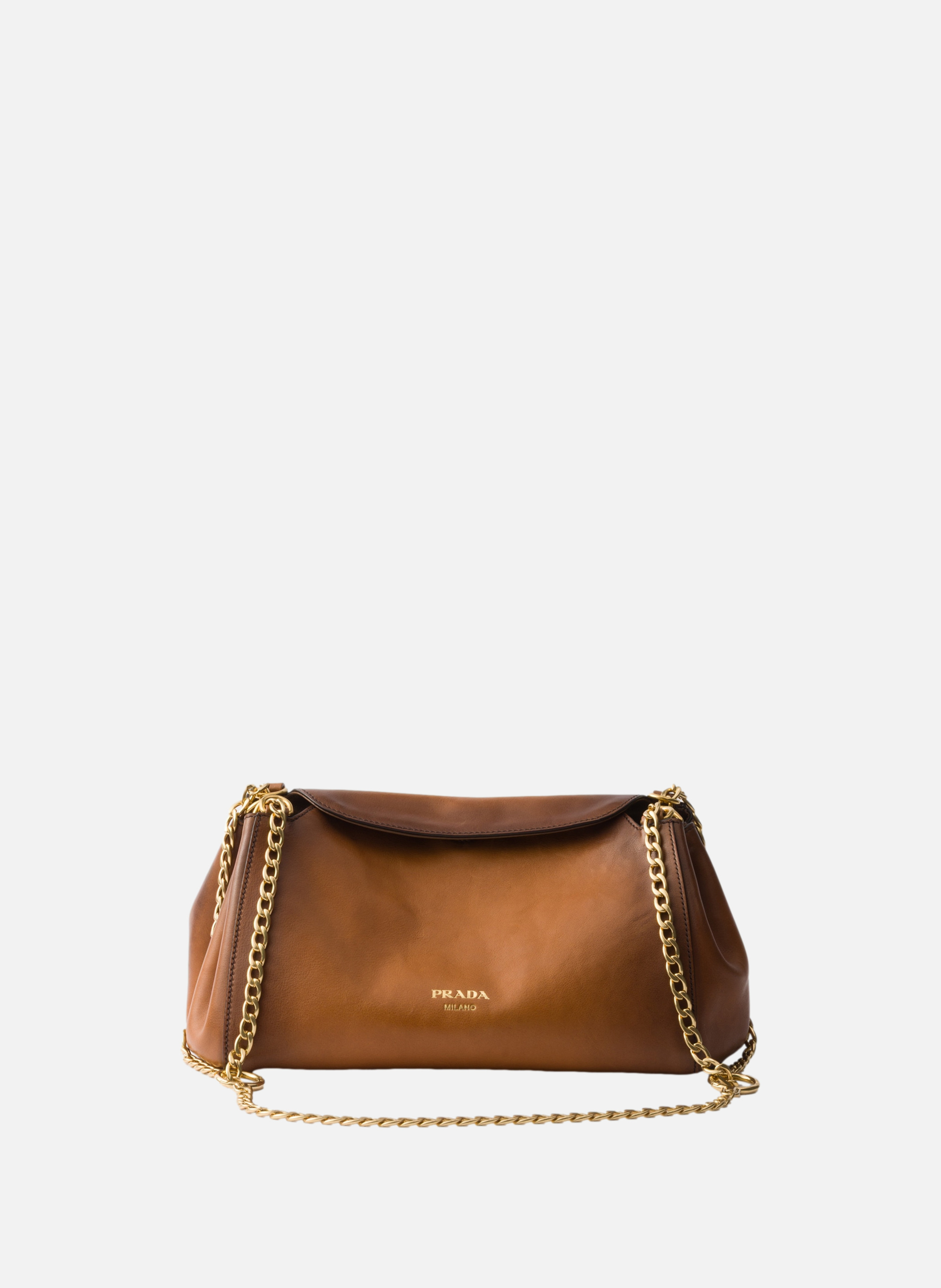 Dans la famille des accessoires, c’est chez les sacs que le cuir semble être la matière chouchou, grâce à sa résistance et sa durabilité. Le petit sac Tumulte de Prada s’habille ici d’un cognac enrichi par un effet ombré. La pièce maîtresse de tout look automnal.