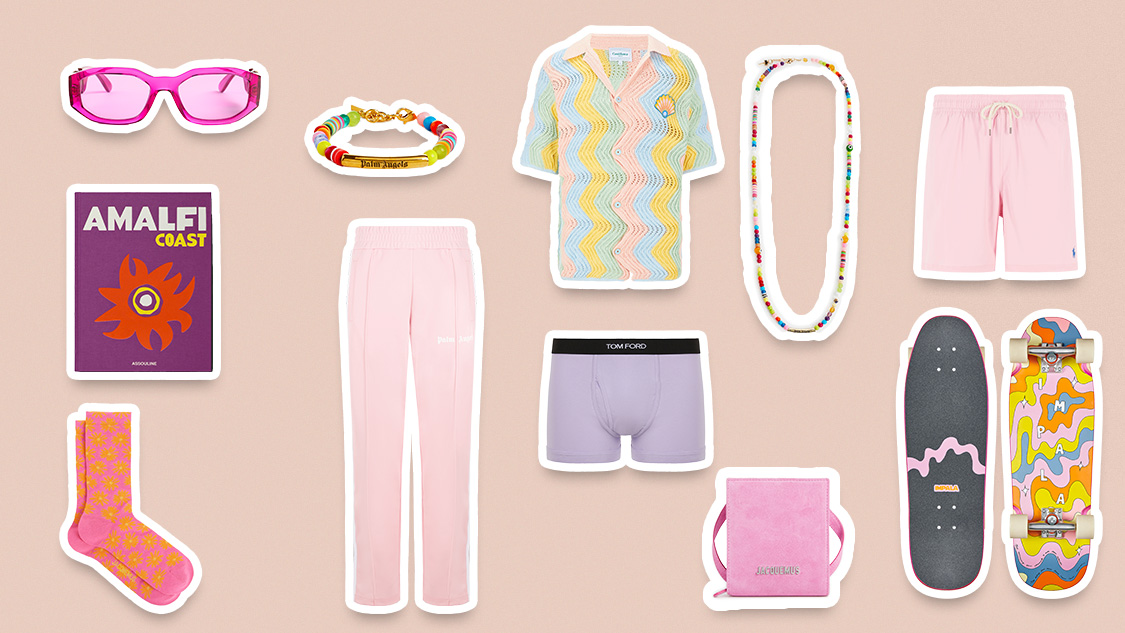 Lunettes de soleil Medusa, 250€ - Jacquemus / Livre Amalfi Coast, 95€ - Assouline / Bracelet Rainbow, 180€ - Palm Angels / Chemise crochet Casa Shell en coton, 825€ - Casablanca Paris / Portefeuille Le Gadjo en suède, 325€ - Jacquemus / Boxer Brief en coton mélangé, 50€ - Tom Ford Underwear / Chaussettes à fleurs, 35€ - Jacquemus / Skateboard, 59,95€ - Impala / Pantalon de survêtement, 325€ - Palm Angels / Short de bain en polyester recyclé mélangé, 75€ - Polo Ralph Lauren / Collier en perles fantaisies, 210€ - Palm Angels