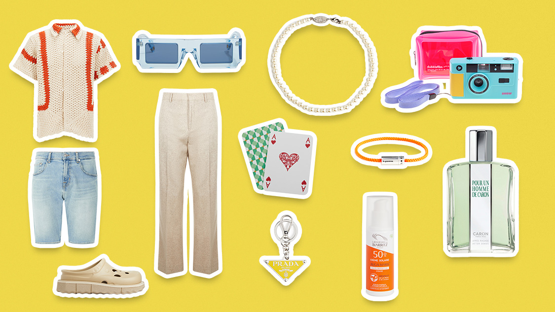 Cartes à jouer, 25€ - Printemps / Alga Maris - Crème solaire Visage SPF50, 19€ - Laboratoires de Biarritz / Sandales Spongesole Meteor en gomme, 350€ - Off White / Collier Stuart, 185€ - Vivienne Westwood / Bermuda en jean, 150€ - 7 For All Mankind / Pantalon en mélange de lin, 270€ - Acne Studios / Lotion Après-Rasage, 57€ - Caron / Lunettes de soleil SOLEIL, 280€ - Jacquemus / Bracelet câble 7g, 190€ - Le Gramme / Appareil photo réutilisable 35mm avec flash, 63€ - Dubblefilm / Porte-clés en acier, 365€ - Prada / Chemise Sunspot en coton, 580€ - Bode