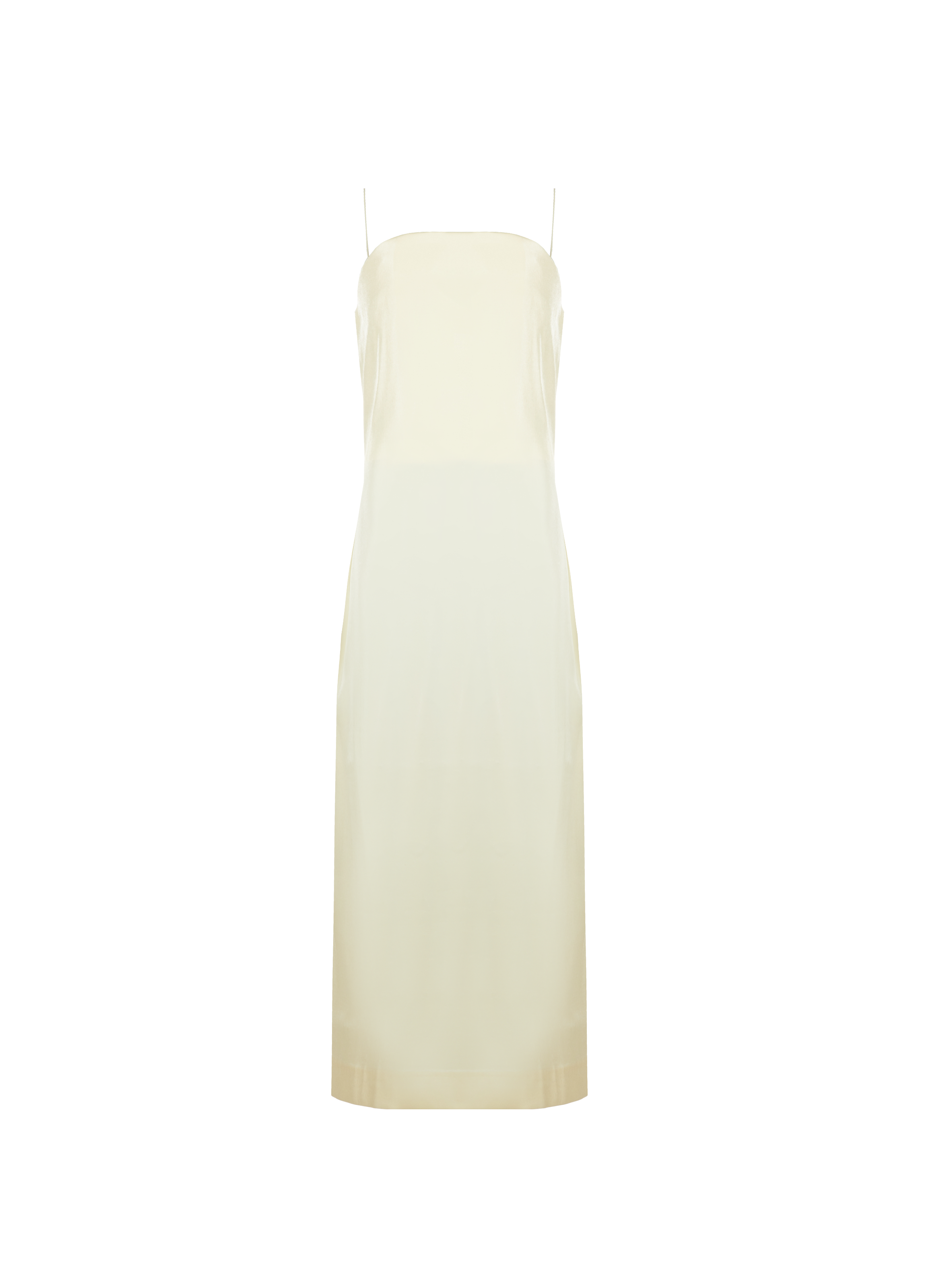 Si l’on ne devait glisser que deux modèles dans sa valise, ce serait sans hésiter la robe longue couleur beurre de Jacquemus et la robe satinée vert amande signée Claudie Pierlot.