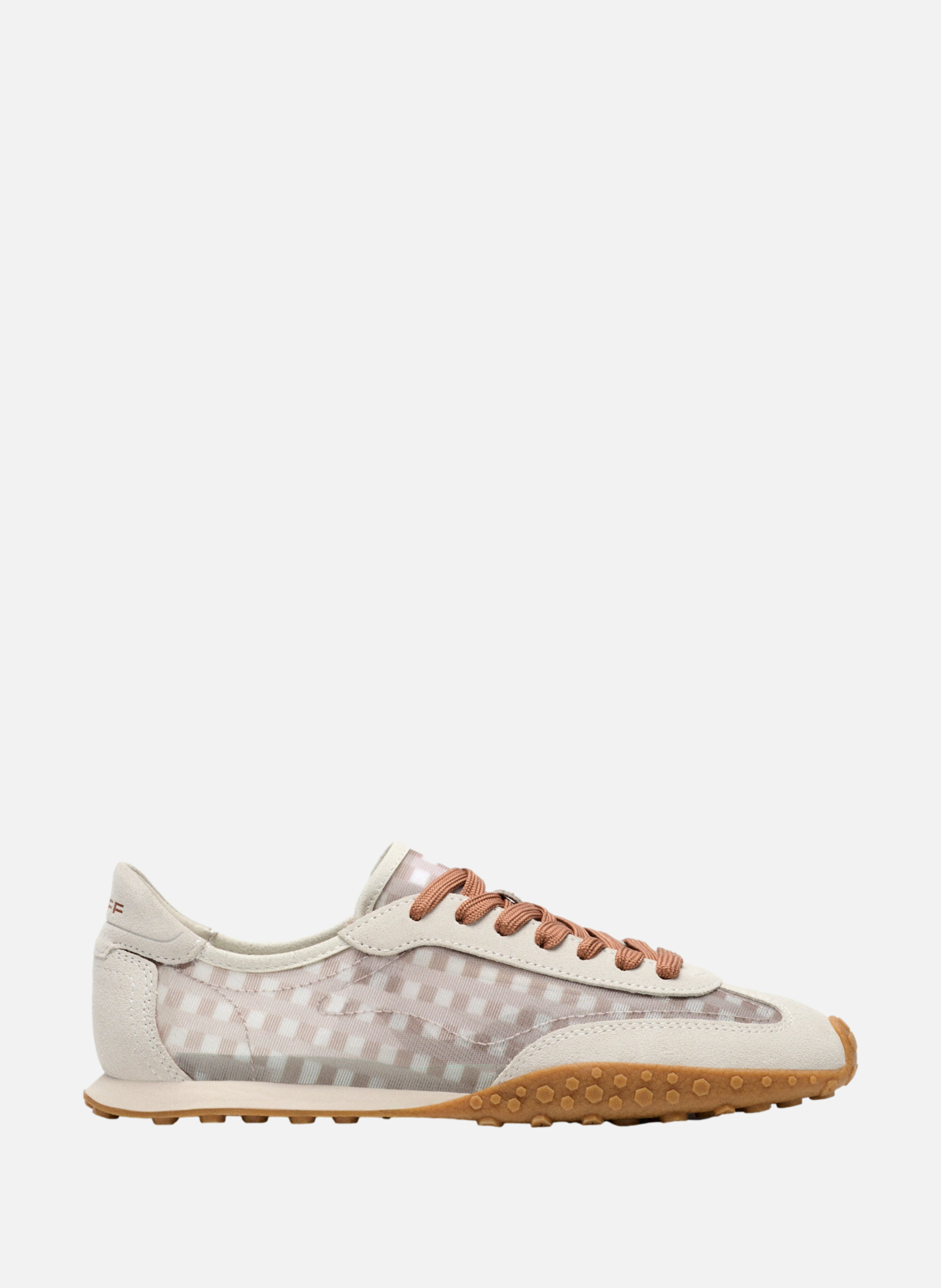 Bridge se réinvente pour l'été, alliant maille vichy et daim doux pour un effet structuré et contrasté. Son design raffiné et moderne se caractérise par un logo discrètement intégré au talon et une semelle en caoutchouc texturé assurant une adhérence optimale.