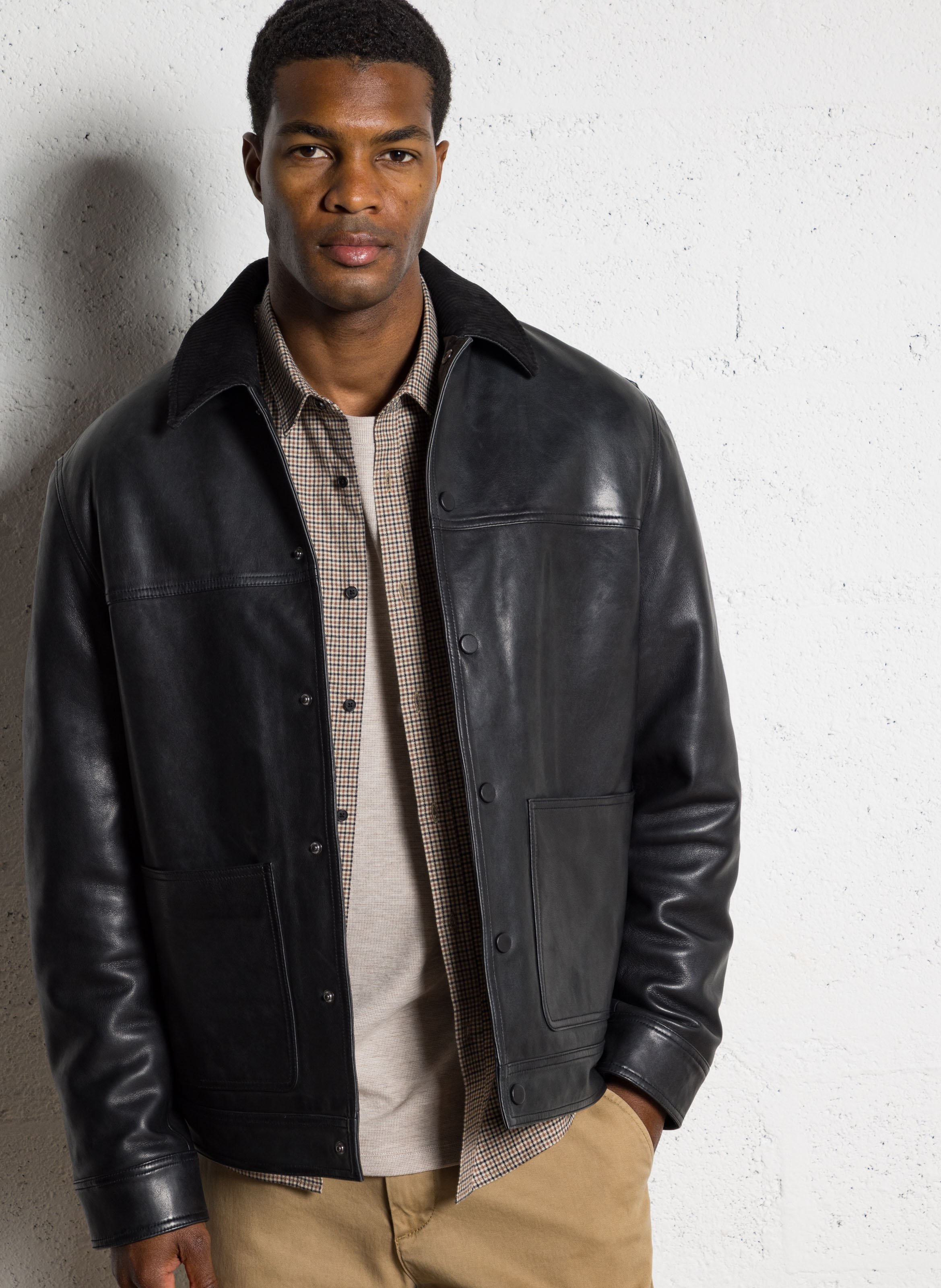 Blouson droit col classique en cuir | Noir