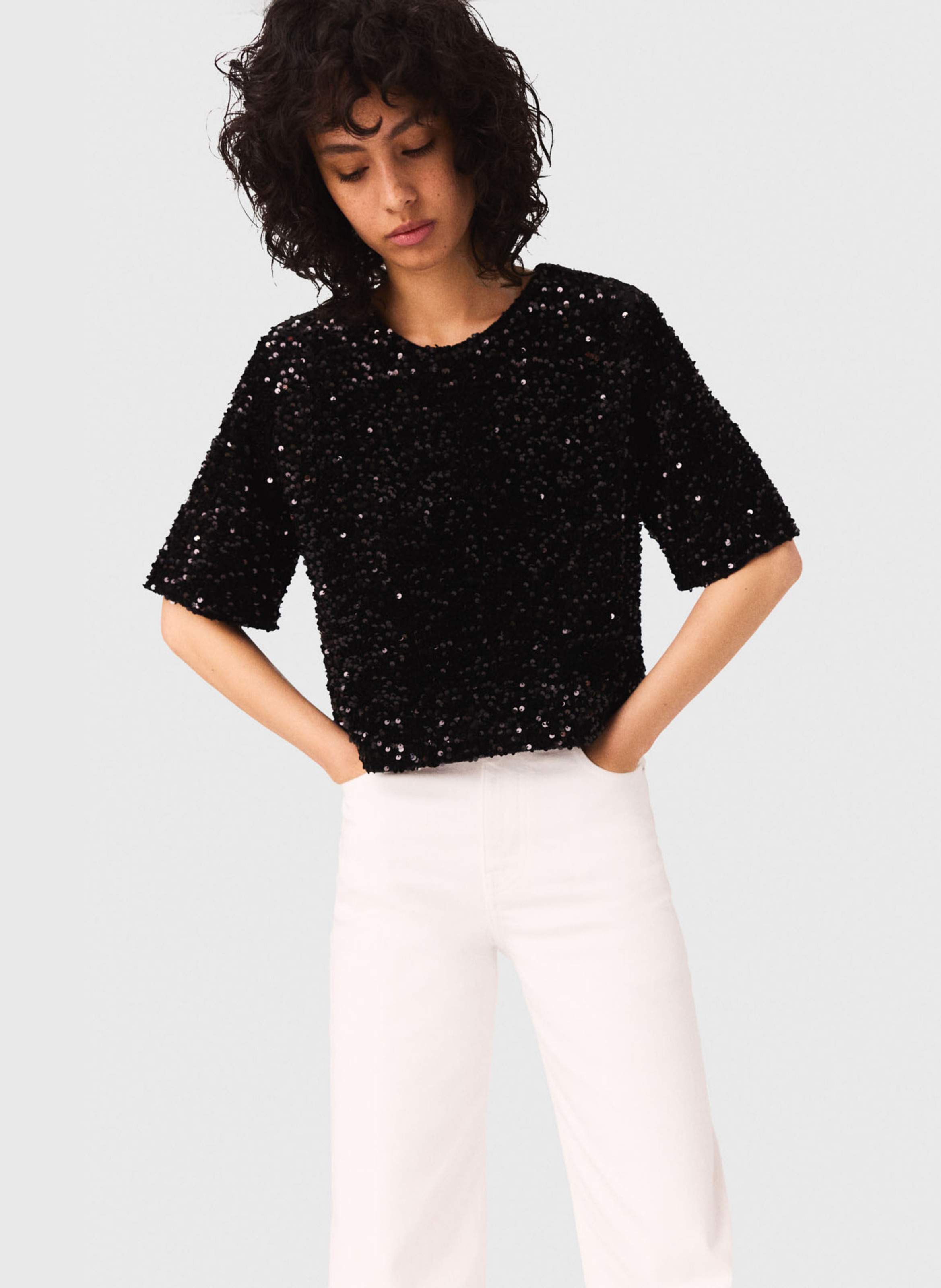 - Top court - Col rond - Manches courtes - Coupe droite - A sequins