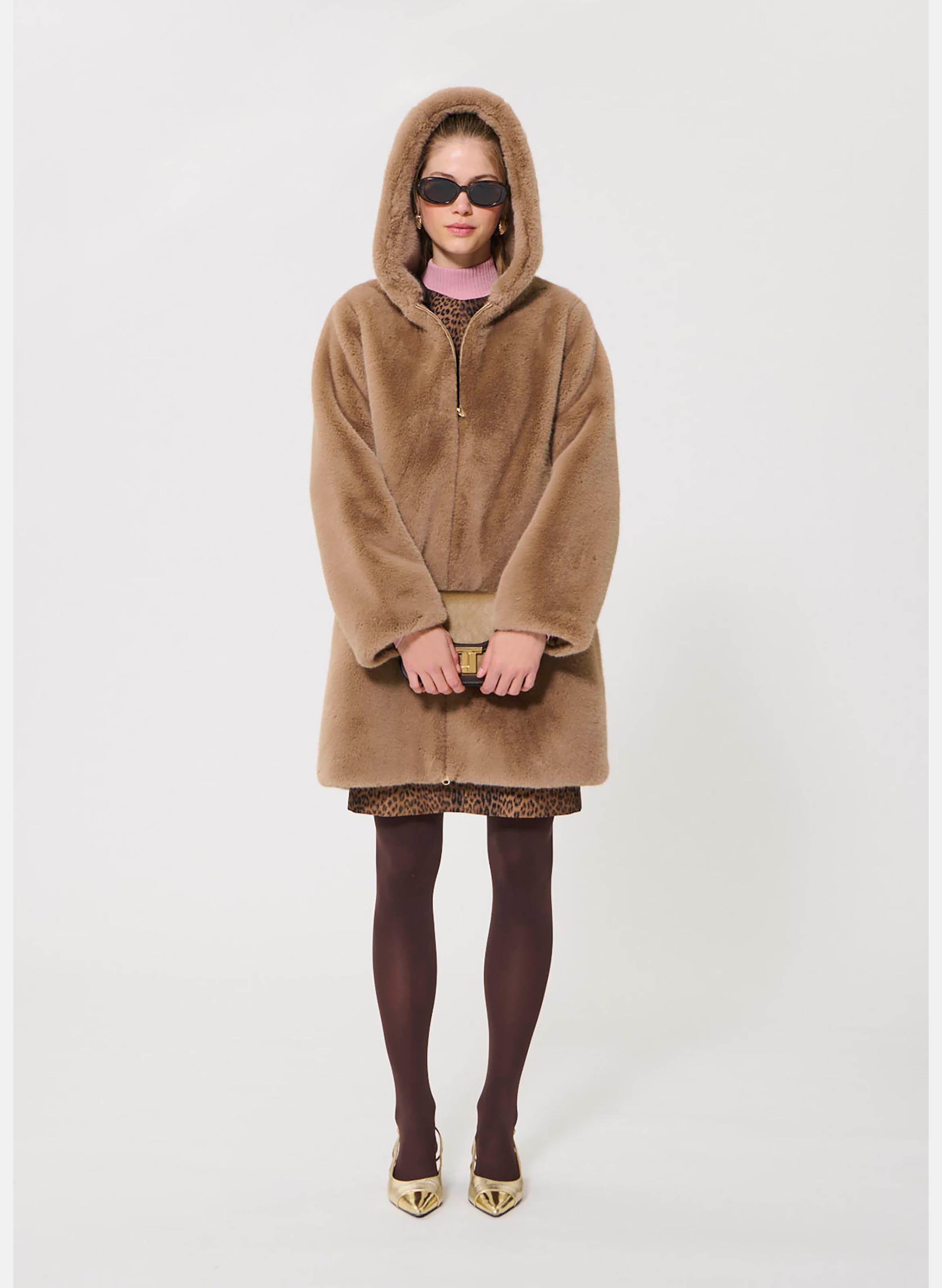 Ce manteau mi-long possède une coupe droite et se ferme par un zip au devant. Ultra cosy, il est confectionné en fausse fourrure ultra douce et possède une grande capuche et des poches aux côtés pour rester bien au chaud tout l'hiver.