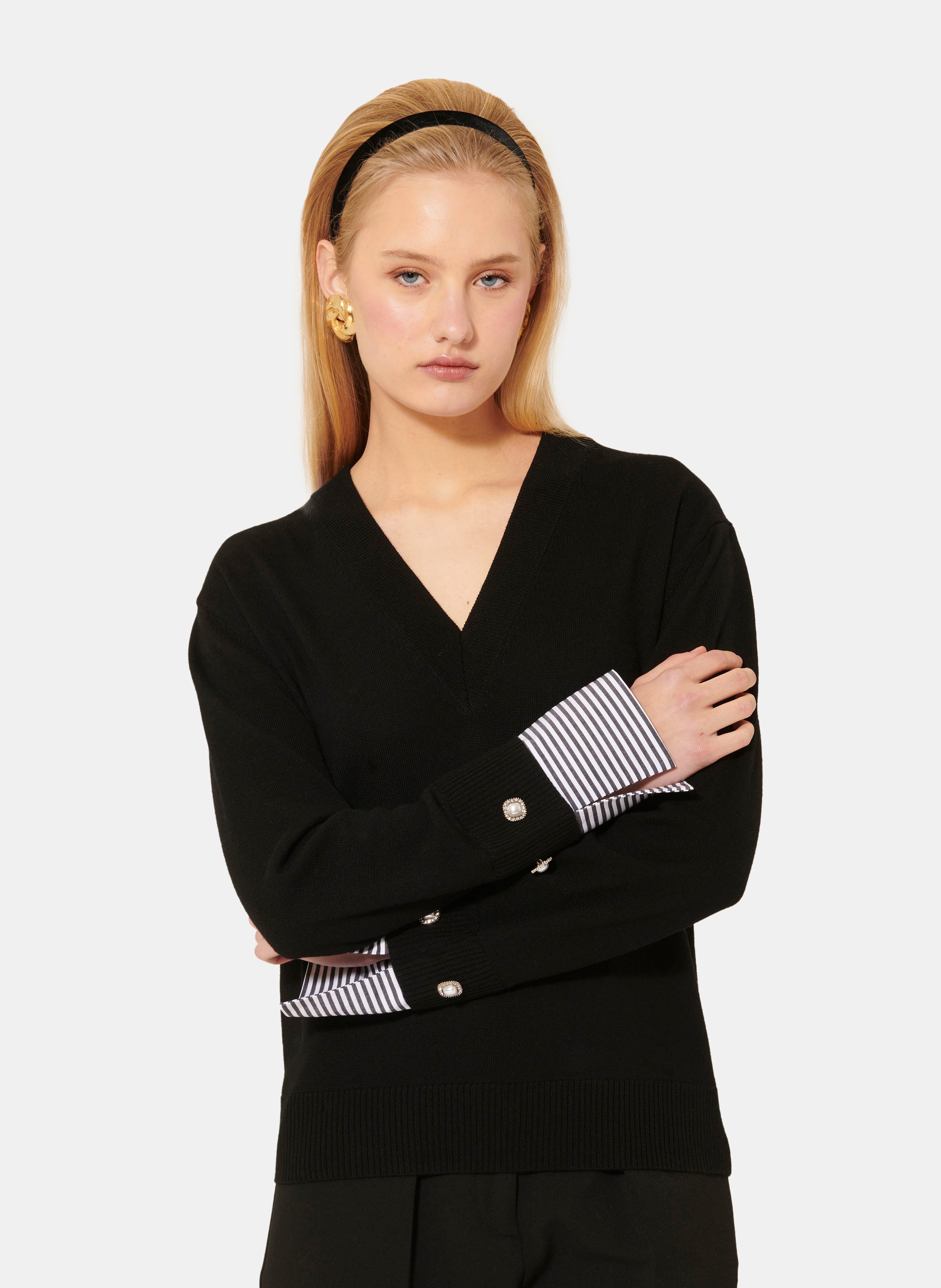 Ce pull possède un col V et des manches longues. La touche so Tara réside dans ses poignets trompe l'œil en popeline à rayures bleues décorés d'un bouton bijoux. Confectionné en laine mérinos, il est doux avec un toucher cachemire ultra confortable.Pour votre information: les frais de retour sont à votre charge, mais on espère que tout sera parfait!
