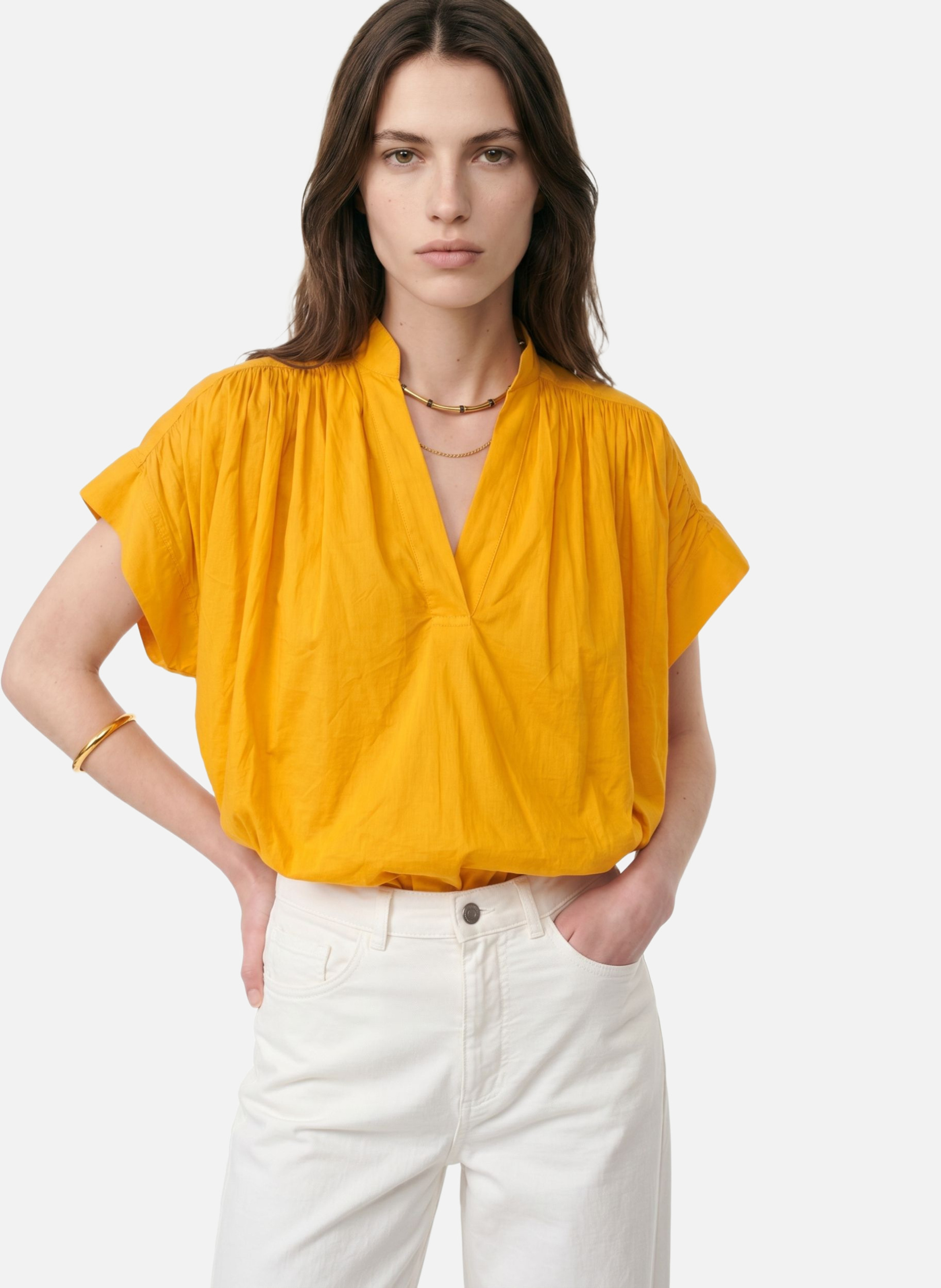 La blouse Cory fait déjà partie des modèles indispensables de la maison. Confectionnée dans un voile de coton aérien, elle se décline en violet cette saison. Sa coupe ample offre une liberté de mouvement et une allure nonchalante. Ses manches kimono courtes et larges apportent un volume maîtrisé en un clin d'oeil.Blouse fluide en cotonCol plongeant en VManches courtes esprit kimonoDétails de fronce au niveau des épaules