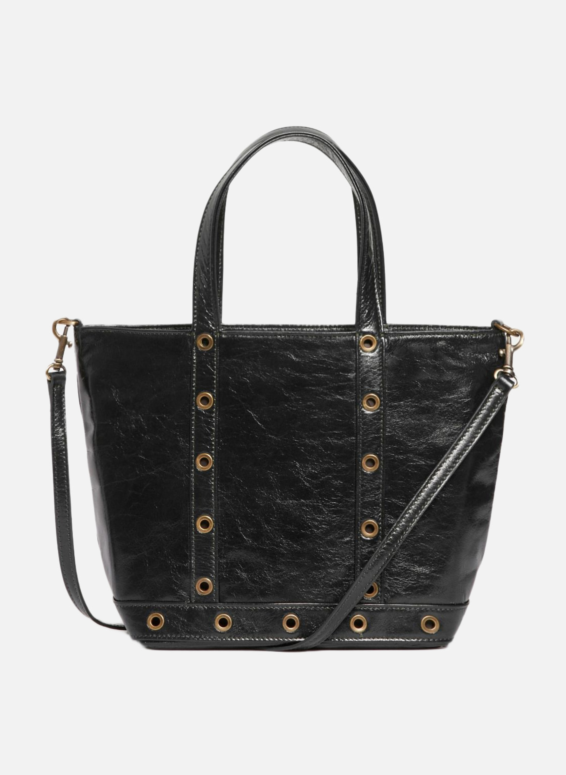 Cabas petit format Cuir de vachette craquelé effet brillant Œillets métalliques décoratifs sur les côtés Double anse porté main Bandoulière amovible pour porté crossbody