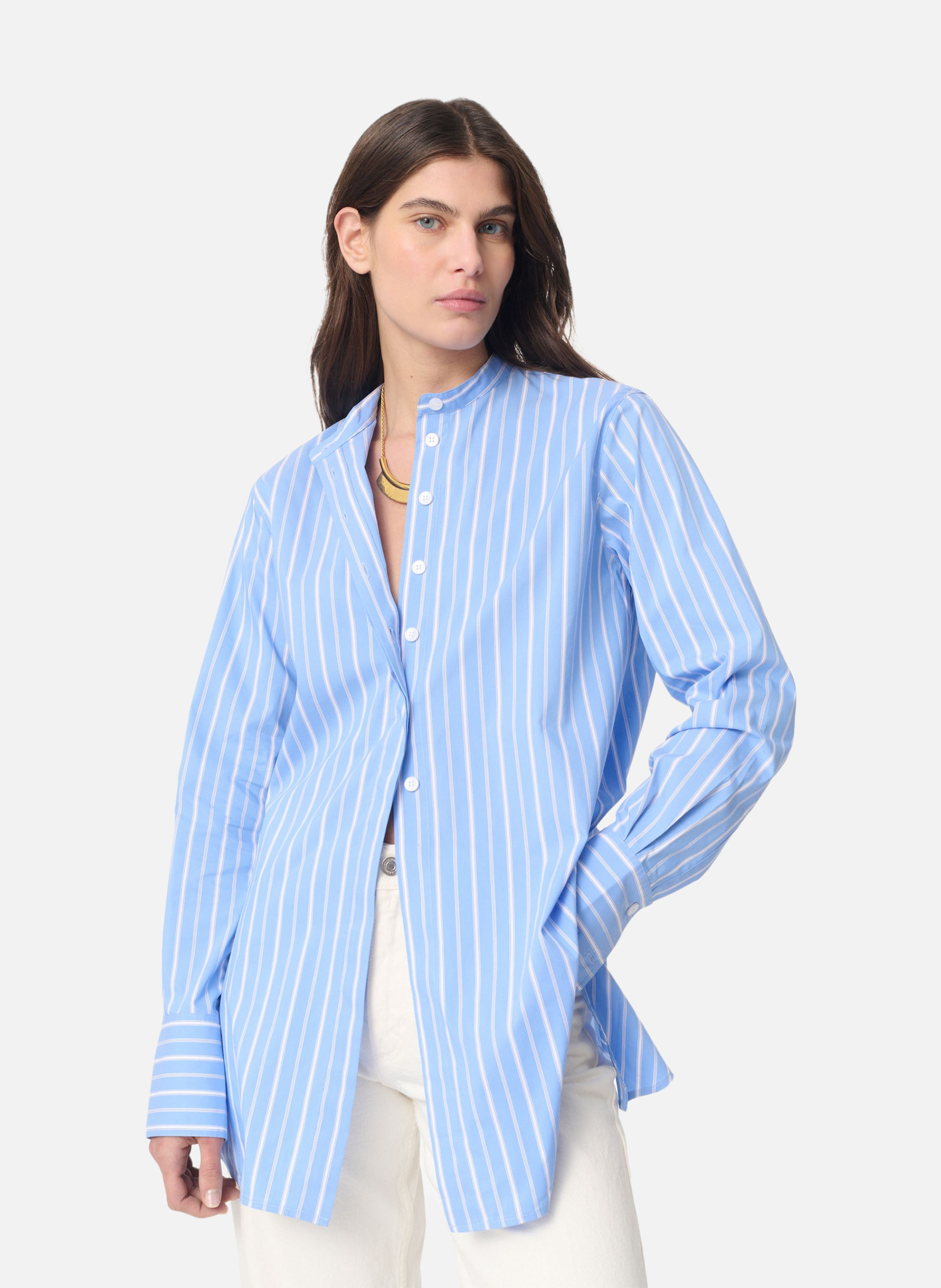 Feline incarne une élégance décontractée grâce à sa coupe longue et fluide.Volume allongéCol MaoManches rallongéesMotif rayé Patte de boutonnage invisible Poignets larges retournésDos entièrement fendu avec pli d’aisance