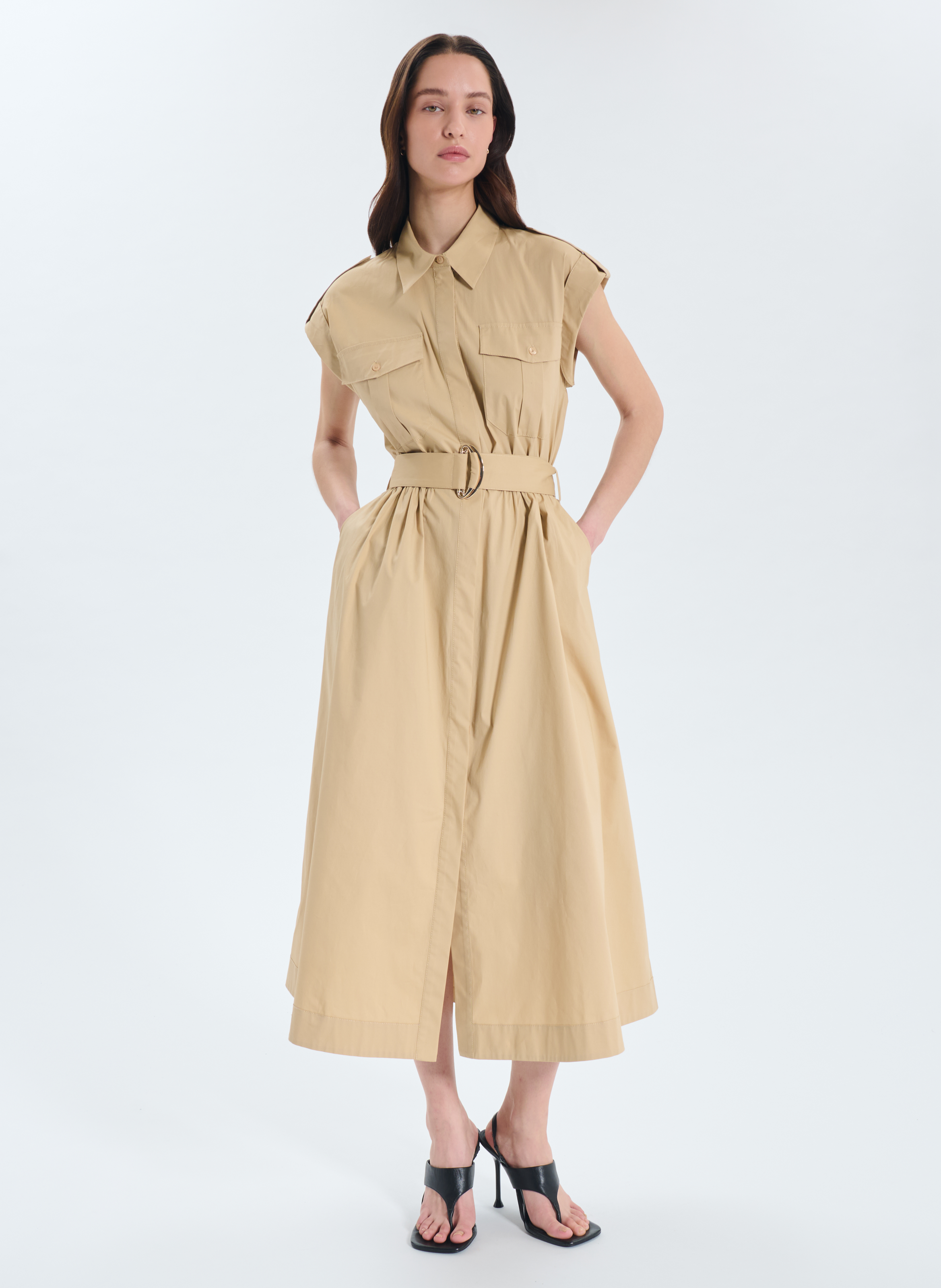 La robe midi s'inspire du style saharien avec sa silhouette fluide et sa matière légère qui garantit un porté confortable. Son col chemise épuré et ses manches courtes à revers soulignent un esprit utilitaire chic. Les poches plaquées à la poitrine ajoutent une touche fonctionnelle tout en restant élégantes. La taille est cintrée par une ceinture avec boucle ronde, vient souligner la silhouette féminine. Une fermeture invisible complète cette création, aboutissant à un look moderne et raffiné, parfait pour une allure casual sophistiquée. Col chemise structuré Manches courtes à revers Poches poitrine plaquées Ceinture ajustable à boucle ronde Fermeture dissimulée sur le devant