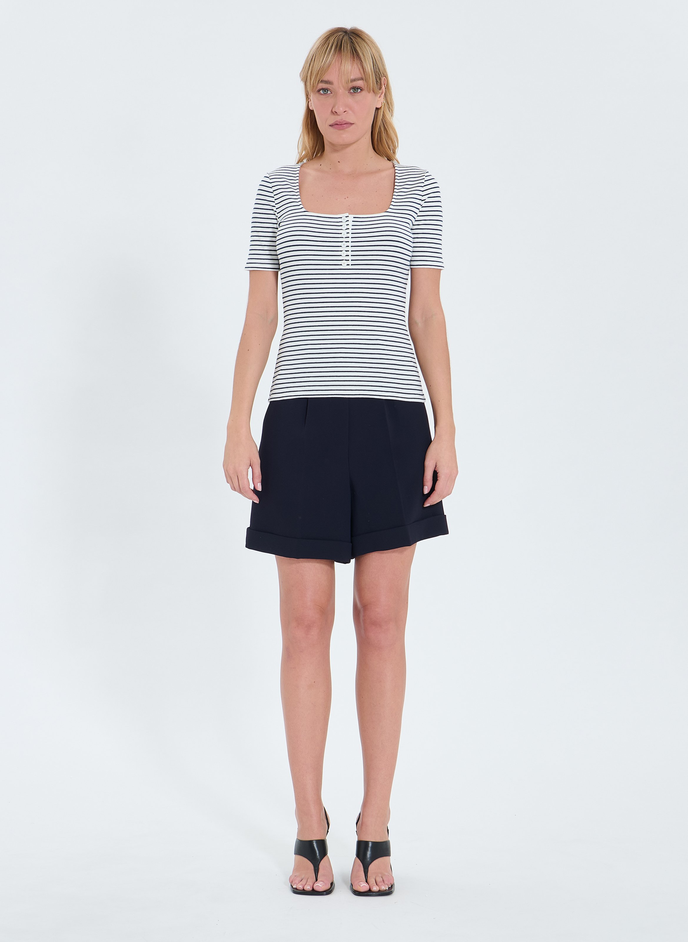 Cette saison, on opte pour les rayures marinières ! Sublimez votre silhouette avec le top ajusté Toyan. Conseil look : à porter avec une pantalon clair pour un look frais et printannier. Top ajusté Col carré Manches courtes Détails boutons Rayures nocturnes et blanches