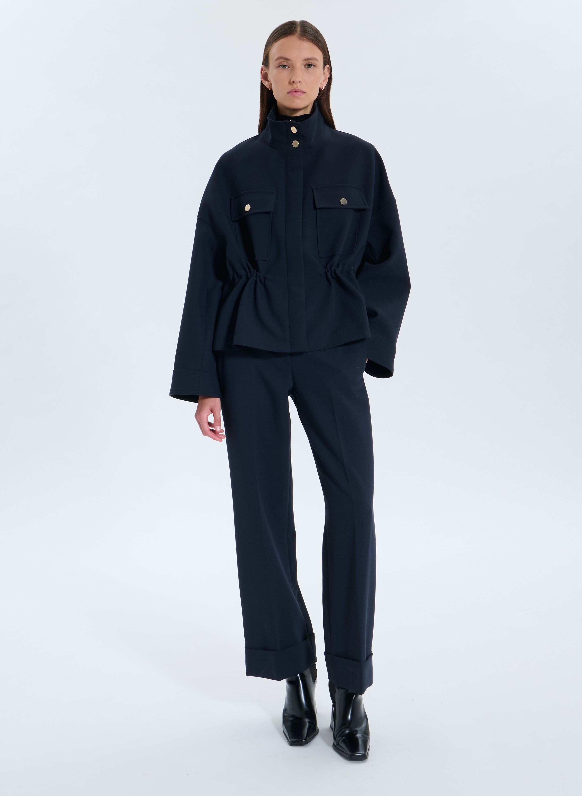 Cette veste courte inspirée de l'univers du safari offre une coupe élégante et moderne. Sa taille s'ajuste à l'aide de cordons pour dévoiler une silhouette féminine et chic. Elle arbore un coloris nocturne idéal pour toute la saison ! A porter avec le panatlon Piel pour un total look moncohrome. Veste courte Cordons à la taille Fermeture zippée à pressions 2 poches à rabat Col montant Coloris nocturne