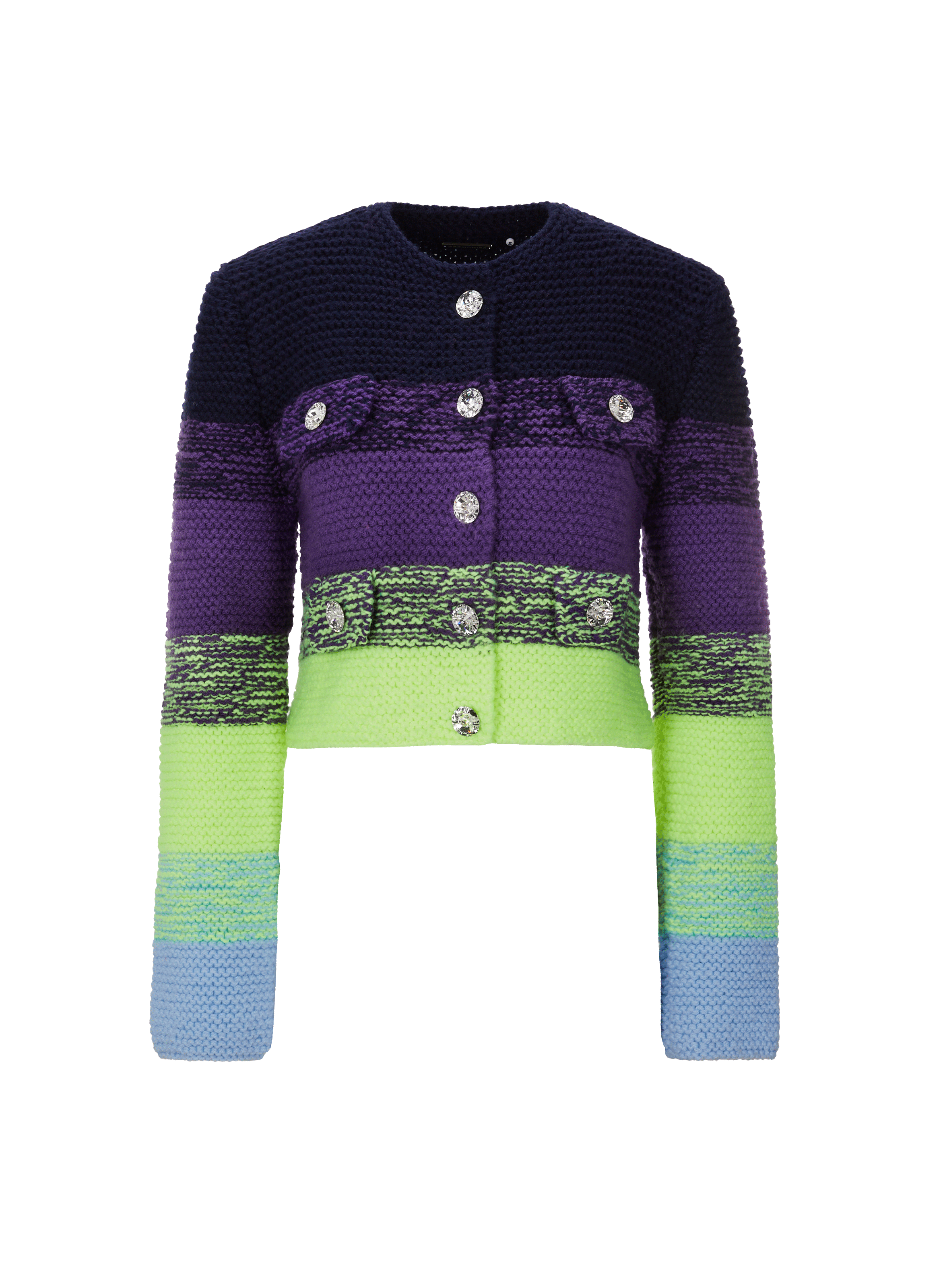 On a des choses incroyables mais on a aussi les basiques Germanier. Un denim, tout le monde en a un. Un t-shirt blanc, tout le monde en aura besoin aussi. Le tricot aussi. C'est un cardigan en laine, qui peut être porté avec votre jean préféré. Ça ne fait pas forcément soirée. Après il y a aussi l'idée que parce que c'est coloré et brillant, c'est conçu pour la soirée. Mais portez-le dans la journée aussi !